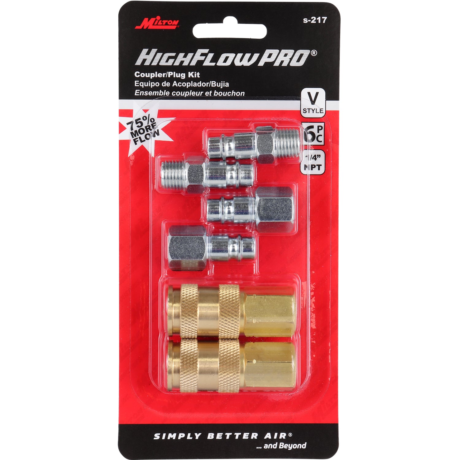 This six piece HIGHFLOWPRO ® V-Style coupler and plug kit includes various coupler and plugs with a 1/4" basic flow size. Milton ® V style plugs will accept M-Style ® and A style plugs, however, to retain maximum flow, only use V style couplers and plugs together. These V style couplers are made of brass, while the plugs are made of steel. Kit includes two 1/4" MNPT plugs, two 1/4" FNPT plugs and two 1/4" FNPT couplers. V style couplers and plugs offer a maximum pressure of 300 PSI and air flow of 74 SCFM.