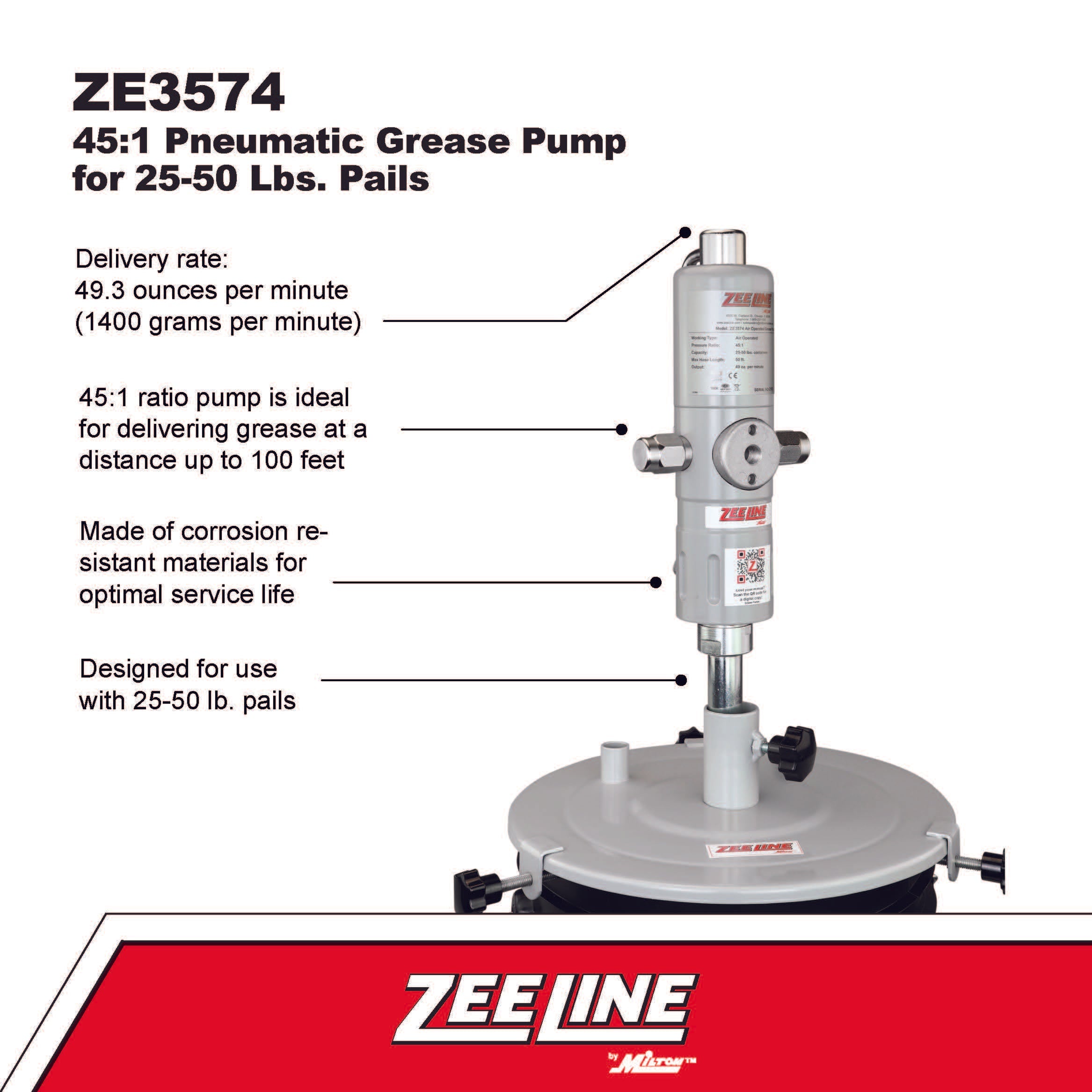 This 45:1 Piston Pump was built with professionals in mind and was designed to be used with industrial and automotive type grease. This versatile pump can be mounted 25-50 Lbs. Grease Pails and is intended to be used with Zeeline by Milton Drum Covers.