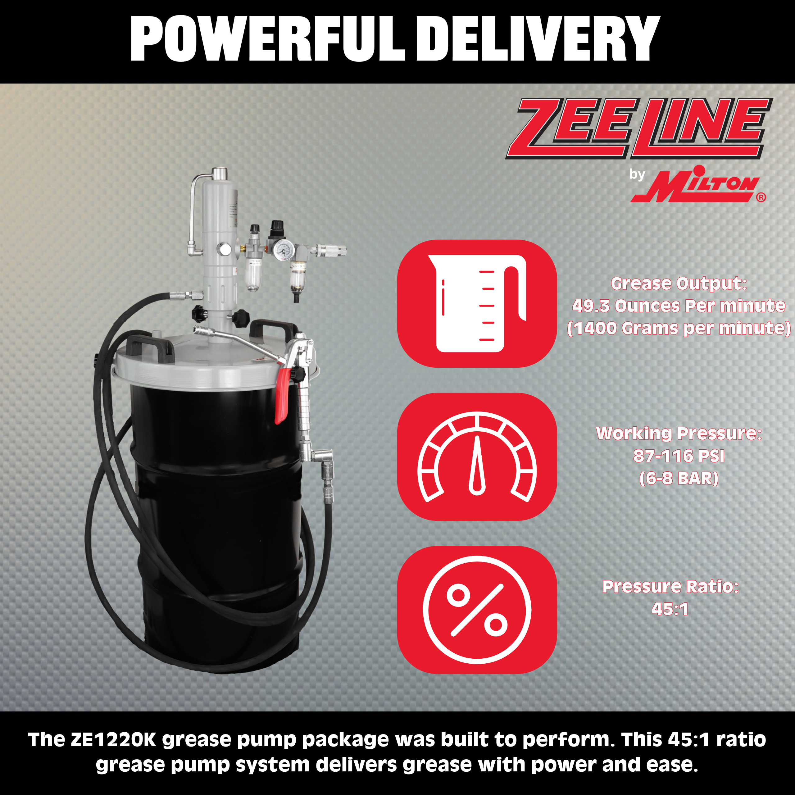 • Heavy-Duty Pump: 45:1 ratio grease pump for short to medium distance applications.