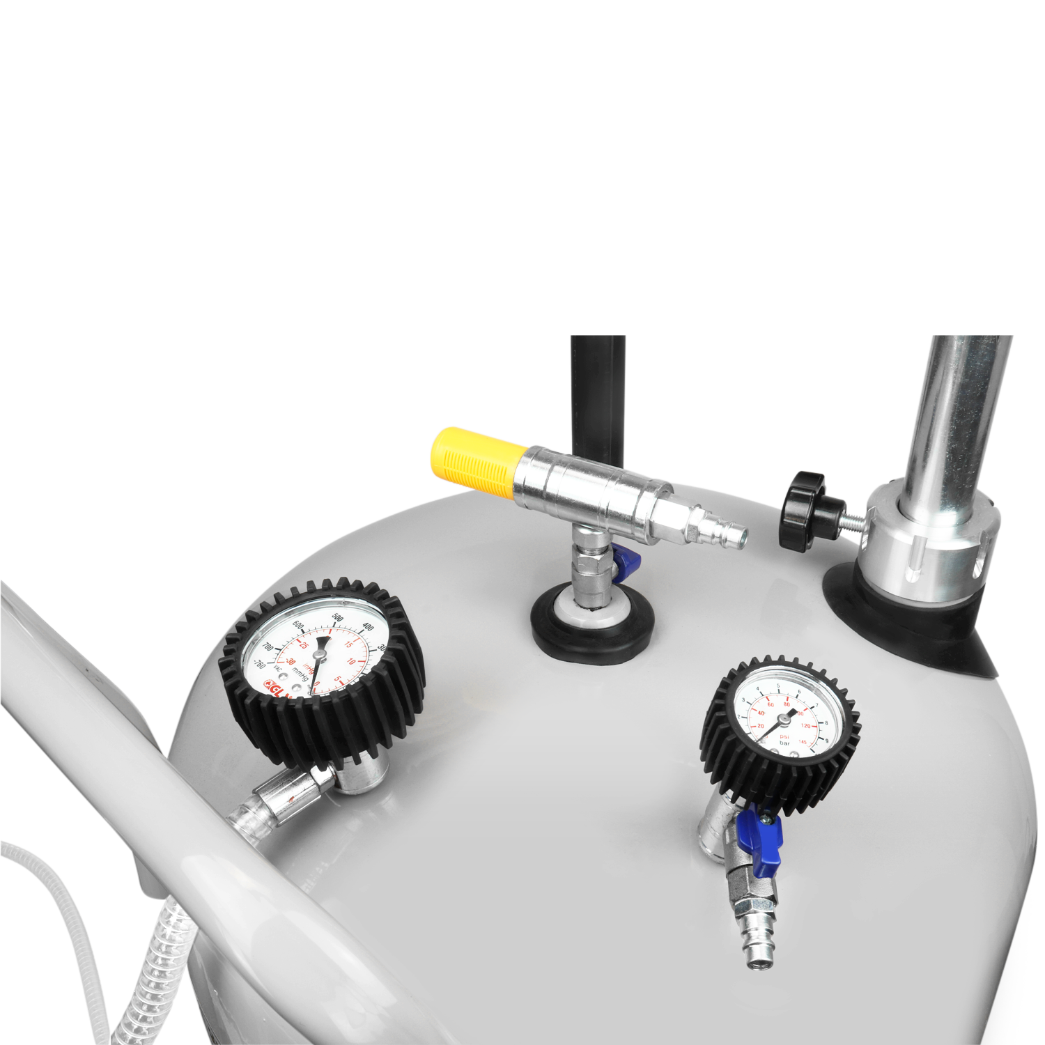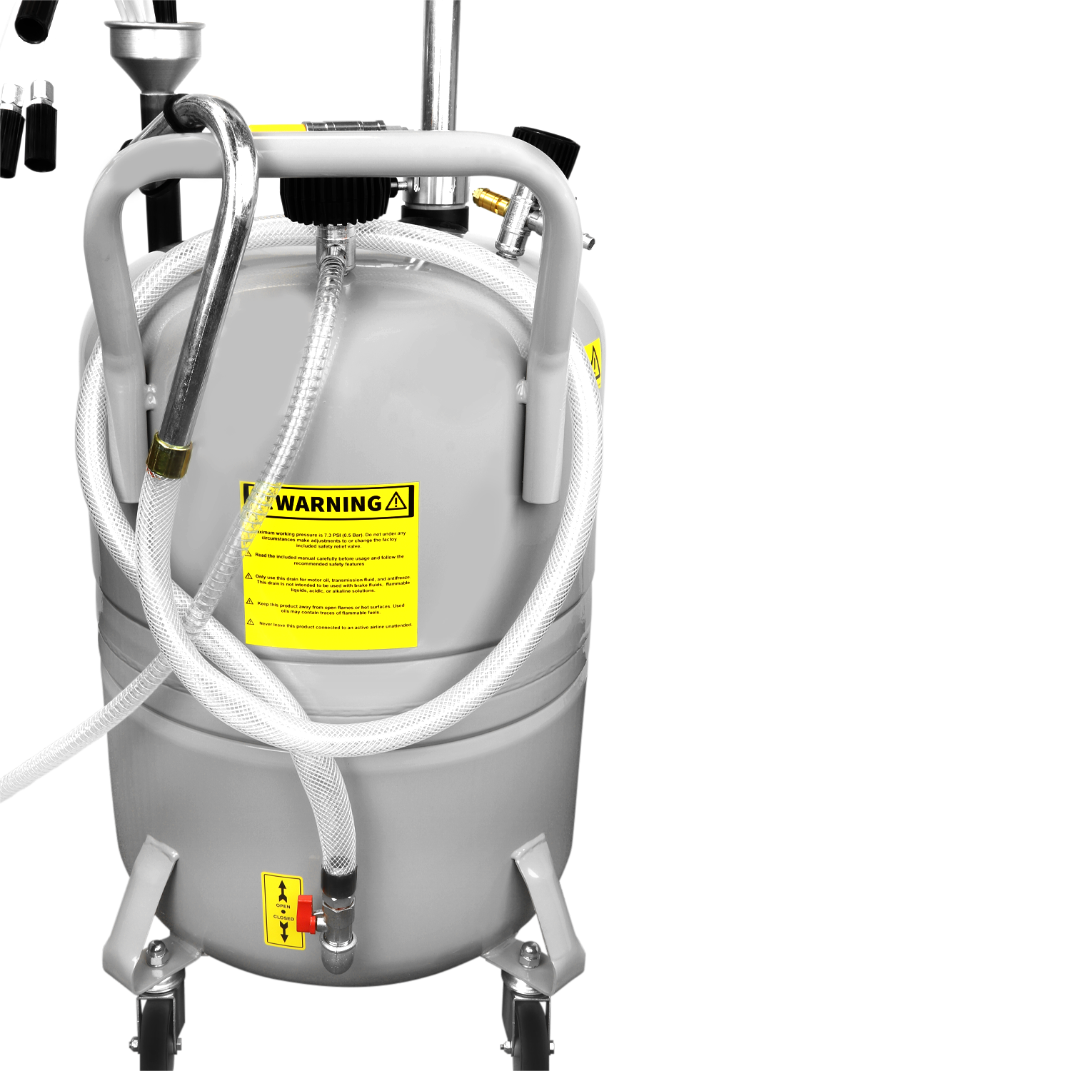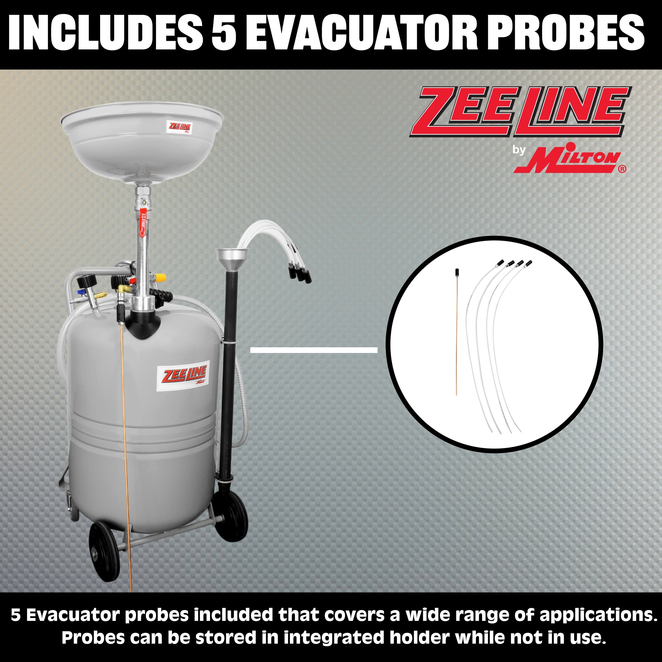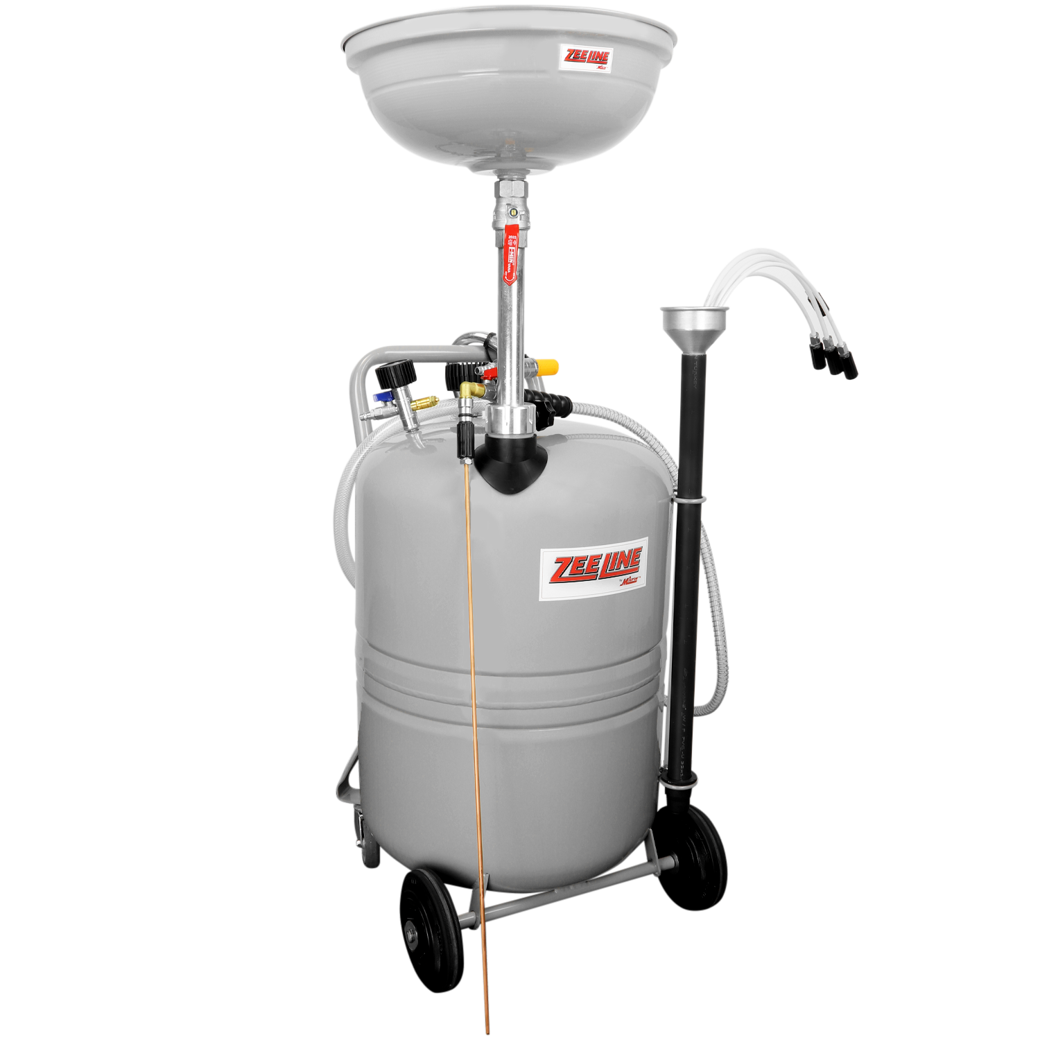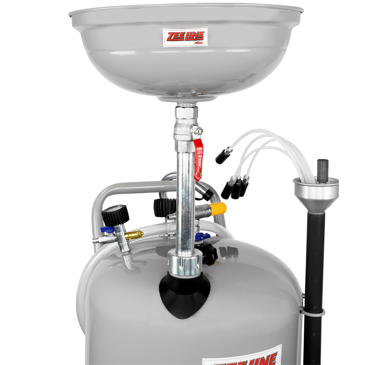 This 21-Gallon Combination Oil drain was built with professionals in mind and was designed to be used when changing oil, transmission fluids, and more for automobiles and light trucks. This combination oil drain can be used as a standard oil drain can be placed under a lifted vehicle or act as a fluid evacuator using the included probes to remove fluids without having to remove the drain plug on the pan which limits shop liability but is also critical for vehicles that do not utilize a dipstick to check fluid levels. This 2-in-1 unit is ideal for smaller shops wanting to service more types of vehicles or larger shops looking to increase productivity in their shops. To use the evacuator function just pressurize the tank with a shop air connection, attach the appropriate probe, insert into the dipstick and watch the oil flow into the evacuator. This unit is also portable so there is no need to leave attached to an air hose during operation after pressurization.